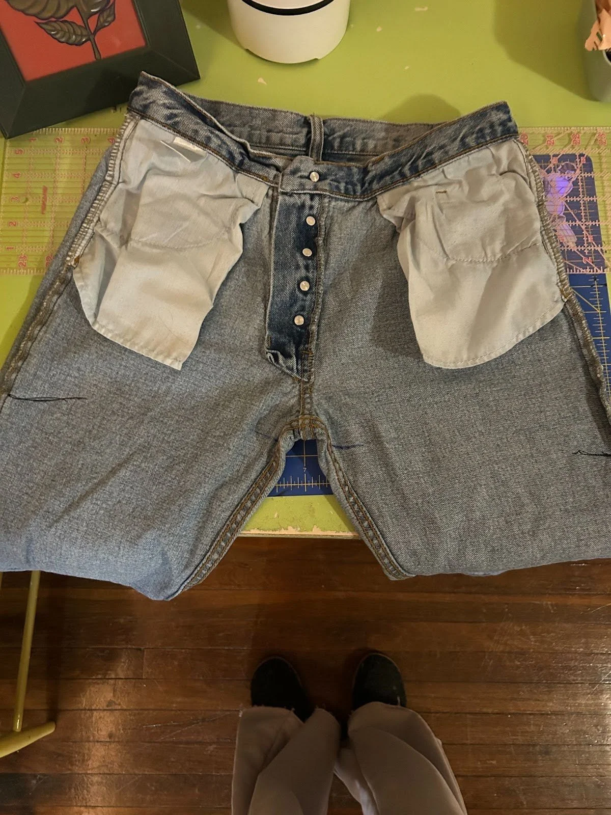 At this point, your jeans officially look like a bag! You can stop here, but adding a lining gives the bag a more polished finish and helps it hold its shape.